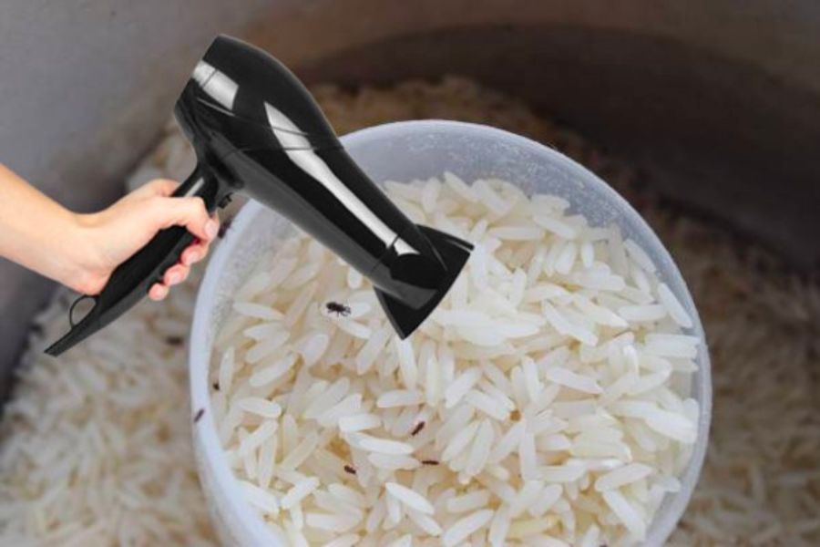 Đầu tiên, trải gạo ra mặt phẳng và bật máy sấy để làm nóng gạo. Hơi nóng từ máy sấy sẽ khiến lũ mọt ra khỏi gạo và sau đó xử lý như cách phơi nắng trên.