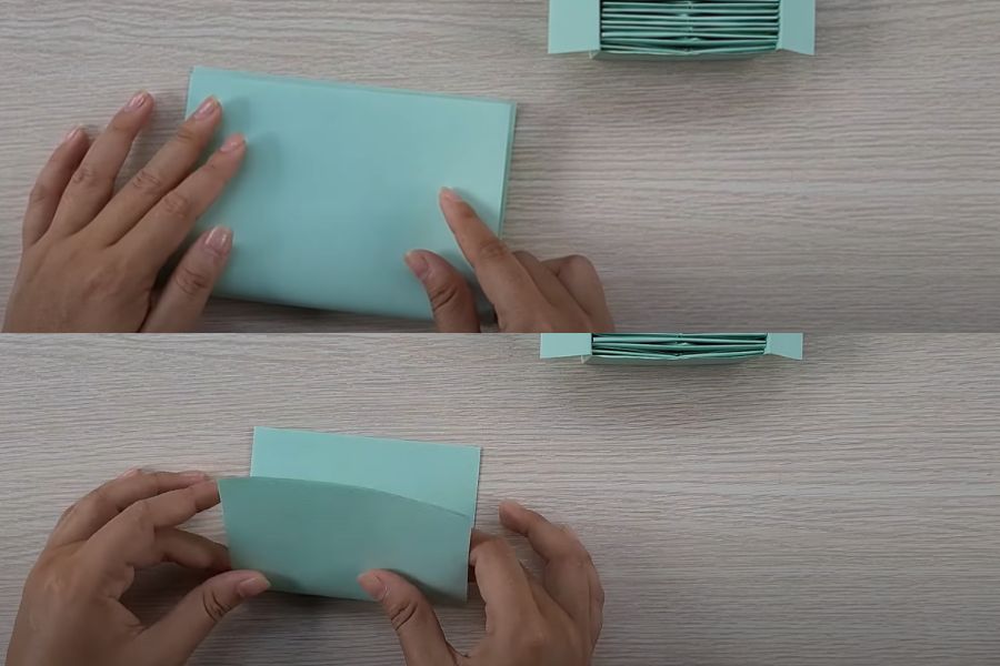 Không thể thiếu trong các bước của cách gấp hộp giấy đó là gấp cạnh tên và cạnh dưới vào trung tâm. Miết chặt tay và giữ nếp như ở bước trên nhé!