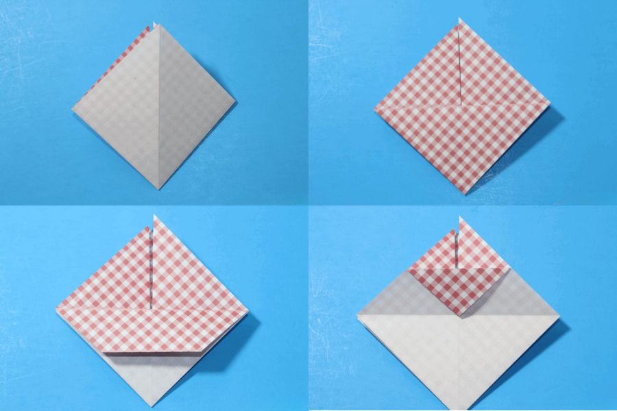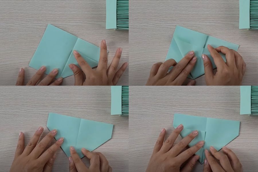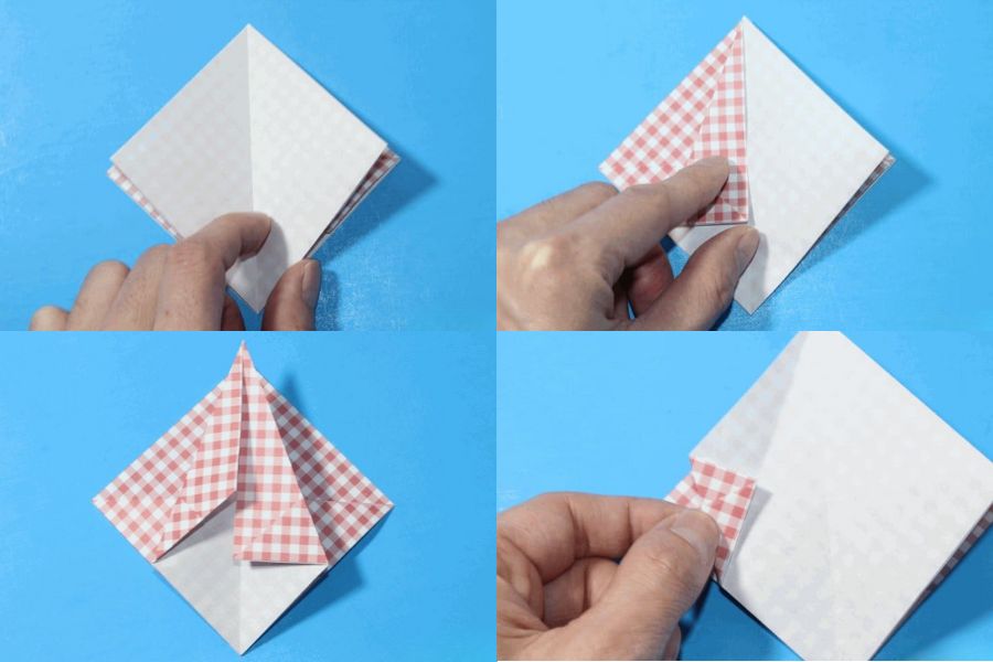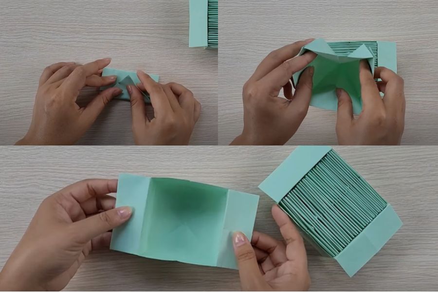 Bước 4: Gấp các cạnh bên trái và bên phải vào giữa, miết nhẹ và mở ra. Tiếp tục, gấp các góc bên trong lên nếp vừa tạo. Gấp phần đỉnh tam giác trên xuống rồi lại gập xuống thêm 1 lần nữa. Sau đó, kéo hai bên ra một cách nhẹ nhàng để hoàn thành hộp.