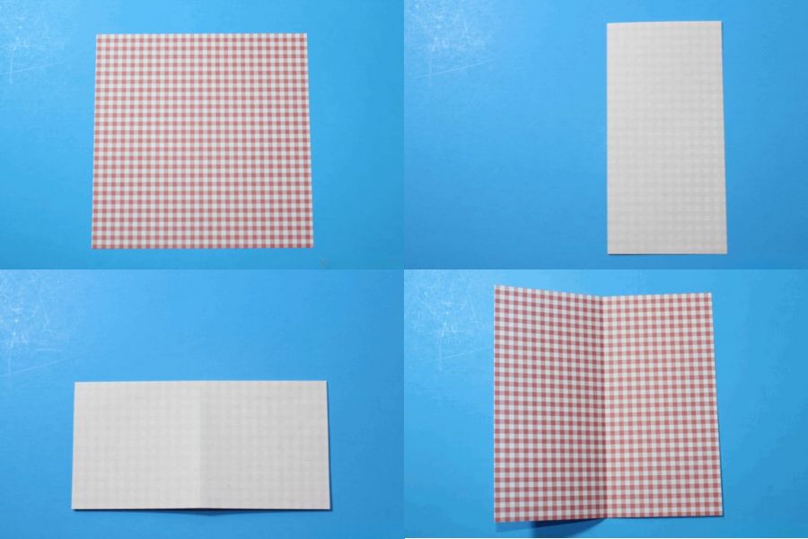 Bước 1: Lựa chọn giấy màu sắc theo sở thích có kích thước 20cm x 20cm (hình vuông), đặt theo hướng ở vị trí hình thoi. Đưa góc trên xuống để chạm góc dưới và gấp tờ giấy làm đôi. Ấn giữ tâm, đưa tay kéo cả góc phải và trái xuống để chạm vào góc, dưới. Sau đó, miết nhẹ để tạo các nếp gấp và mở ra.