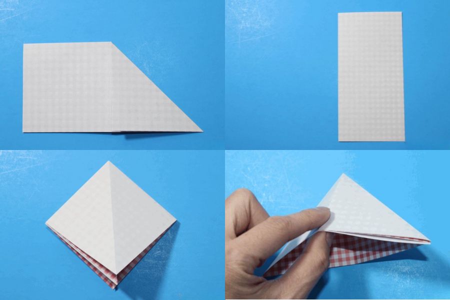 Gấp hai mép giấy ở hai đáy hai hình tam giác vào giữa. Chúng ta sẽ có kết quả như hình dưới đây.