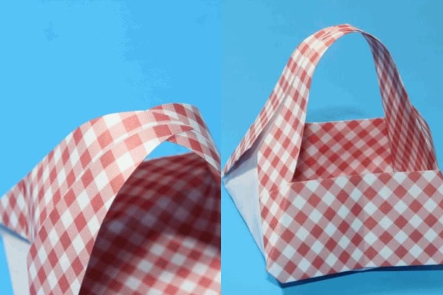 Bước 5: Lật vạt trái sang phải, sau đó gấp hình tam giác phía dưới lên, gấp nếp rồi mở ra. Mở túi ra và dùng hai tay tạo thành hình hộp vuông. Ấn nhẹ phần đáy giỏ thành hình vuông để giỏ có thể tự đứng vững.