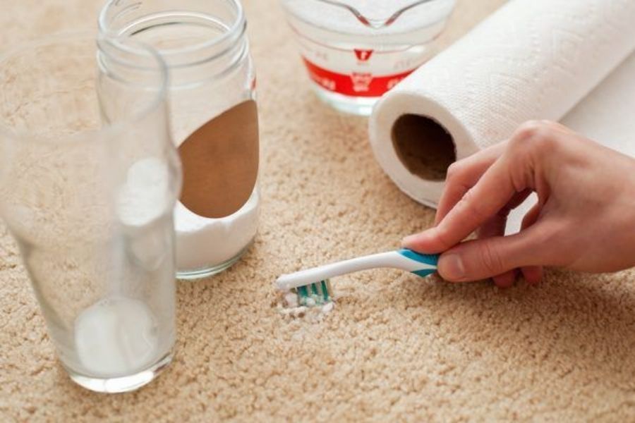 Cách 2: Bạn có thể kết hợp baking soda với bột giặt có tính kiềm hoặc nước ấm với giấm ăn rồi xịt trực tiếp lên vết bẩn. Đợi khoảng 5 đến 10 phút bạn tiến hành dùng bàn chải mềm chà nhẹ vết bẩn rồi dùng khăn khô thấm hết dung dịch đi.