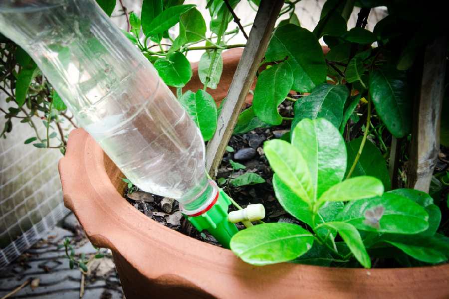 Bạn có thể sử dụng chai nhựa (tốt nhất là cổ cao) để làm hệ thống tưới giúp giữ nước cho cây khi đi xa được khoảng 4-6 ngày.
