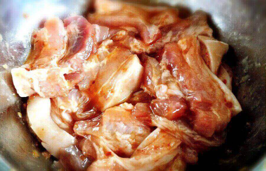 Tiếp theo, ngâm thịt theo với nước muối và cắt nhỏ thành từng miếng dày. Sau đó ướp thịt heo cùng với các hỗn hợp gia vị như muối, tiêu, nước mắm, hạt nêm.