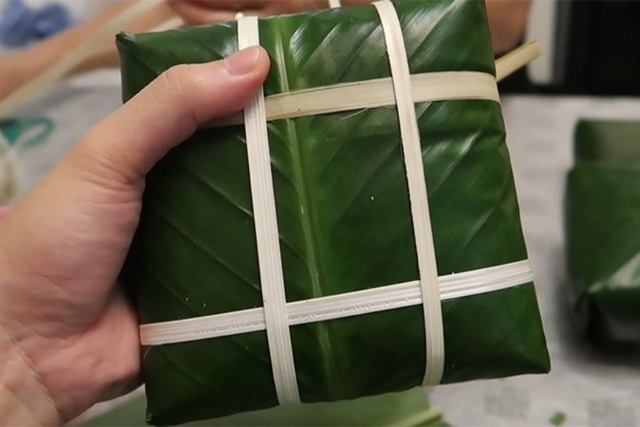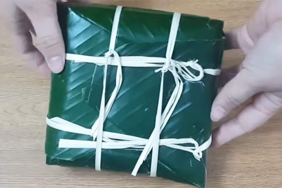 Cắt lá chuối thành 2 sợi dài khoảng 25cm, dùng các sợi này để buộc bánh thành 2 đường vuông góc nhau để cố định bánh là hoàn thành.