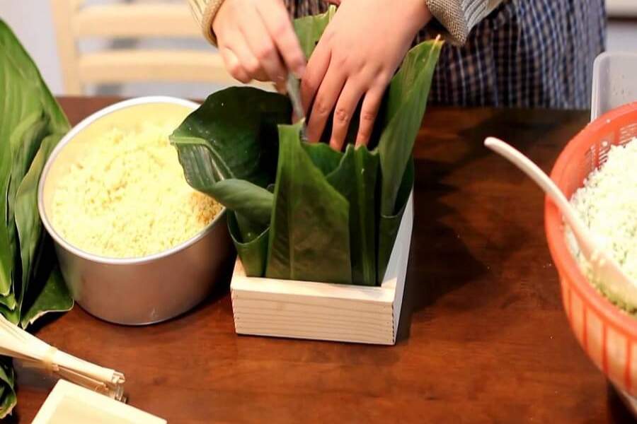 Bước 2: Xếp lá dong vào khuôn