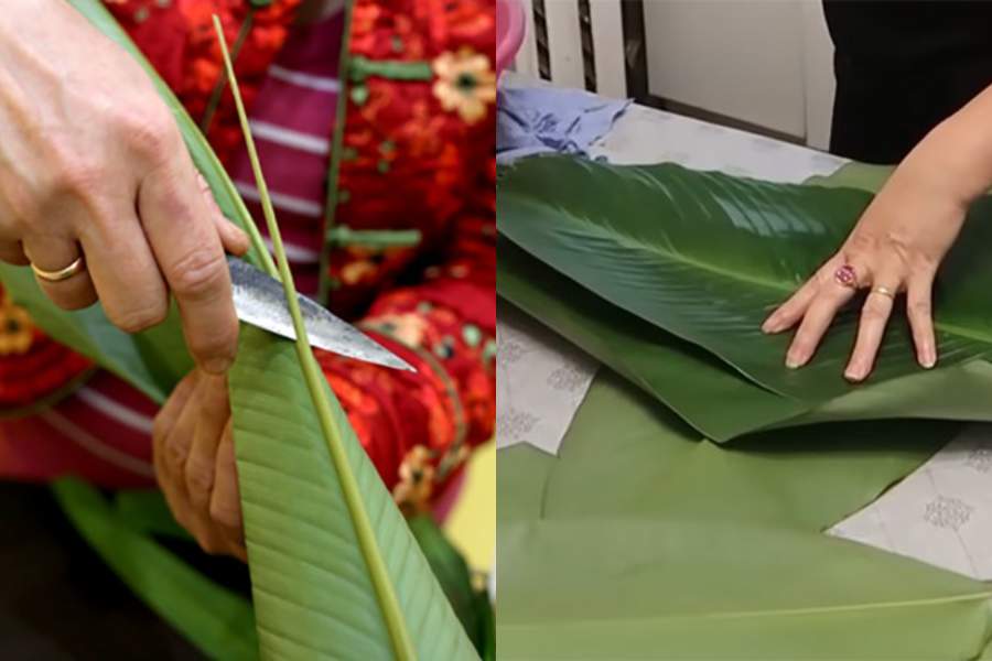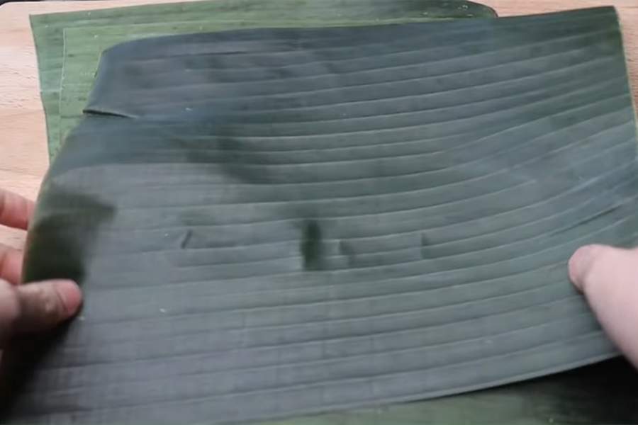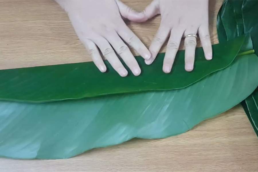 Dùng khăn lau sạch lá chuối và phơi nắng 10 – 15 phút cho lá héo bớt. Cắt lá thành 3 phần rộng 35 cm.