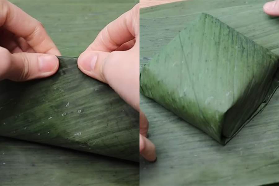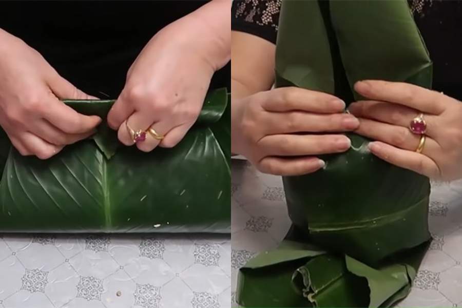 Sau khi cho nguyên liệu, tiến hành gấp 2 mép lá đối diện vào nhau và dùng dây lạt để buộc chặt bánh.