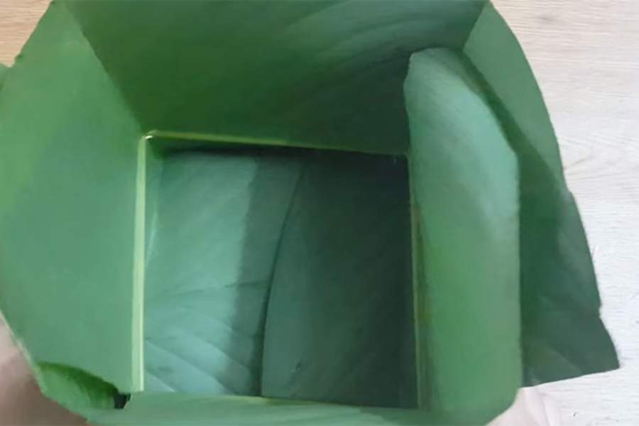 Mở và gấp chéo lá để 2 mép lá vuông nhau, các lá thừa sẽ lật vào trong. Xếp 4 lá vào nhau để tạo thành khuôn lá.