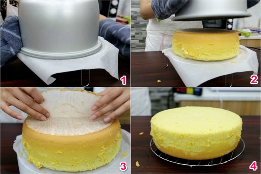 - Nhấn ngón tay lên mặt bánh, nếu lõm vào và phồng lên ngay tức là bánh đã chín.
