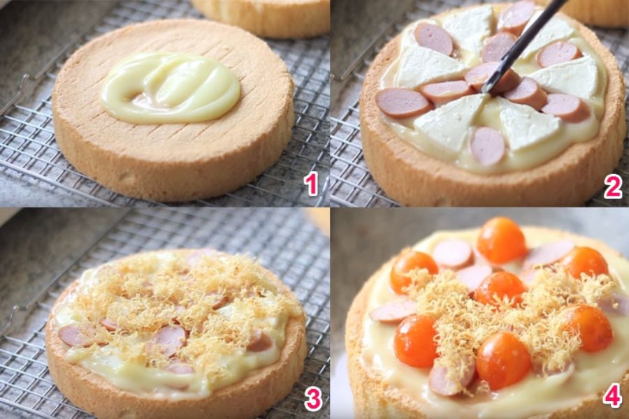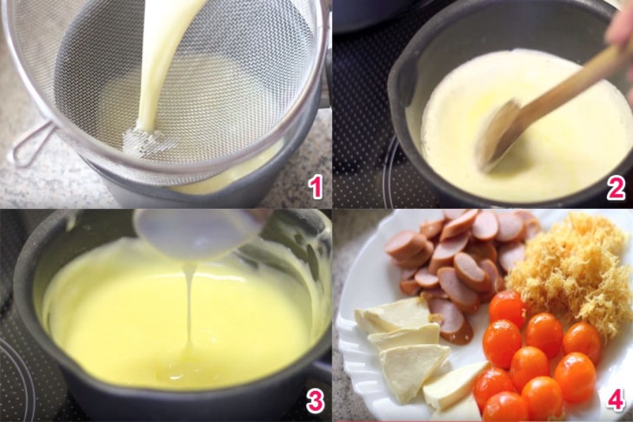 Lưu ý, không nên khuấy quá lâu vì sẽ khiến cho hỗn hợp đặc lại và không ngon. - Cuối cùng, chuẩn bị phần nhân chà bông, trứng muối, phô mai đã cắt đôi, các miếng xúc xích đã cắt nhỏ (hình 4).