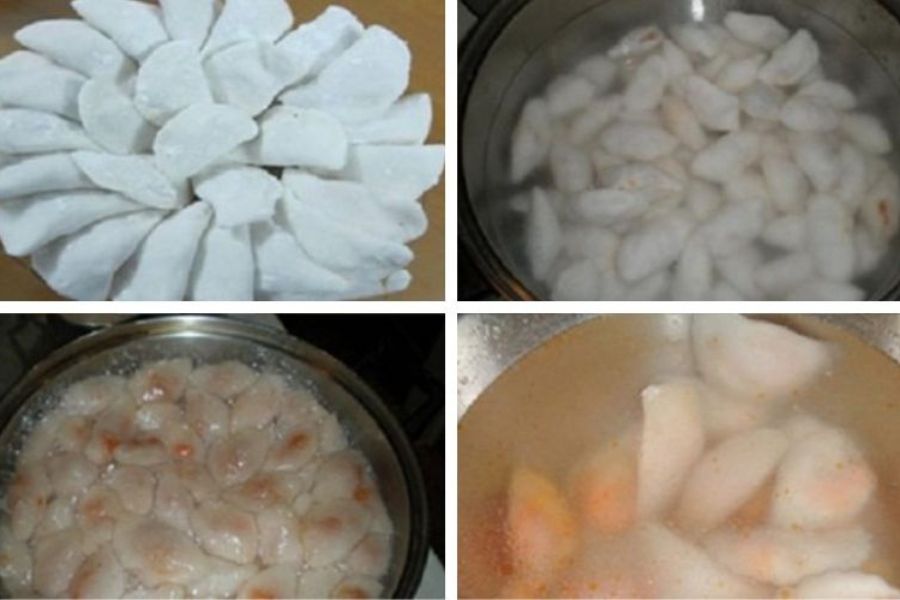 - Đầu tiên đun nước sôi, sau đó cho một ít dầu ăn với muối rồi thả bánh vào. Luộc cho đến khi bánh nổi dần lên trên bề mặt nước thì có thể vớt ra.