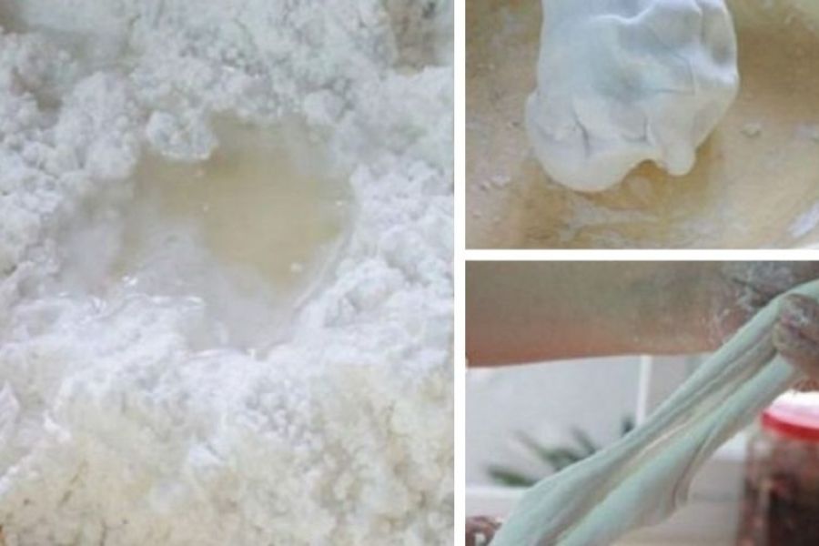 - Kế đến, dùng tay nhào bột cho đến khi thấy bột thành một khối mềm dẻo thống nhất.