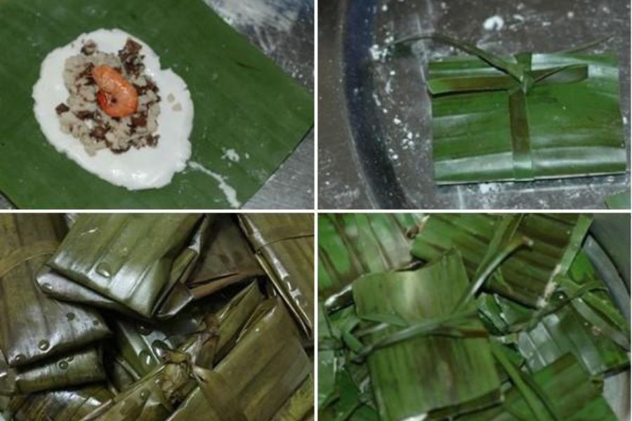 Bước 5: Chia bột thành từng miếng nhỏ, đặt vào lá chuối. Sau đó cho nhân thịt mộc nhĩ và tôm vào giữa, gấp đôi lá chuối lại, dùng dây buộc phần giữa cẩn thận. Cứ thế gói lần lượt cho đến khi hết nhân và bột.