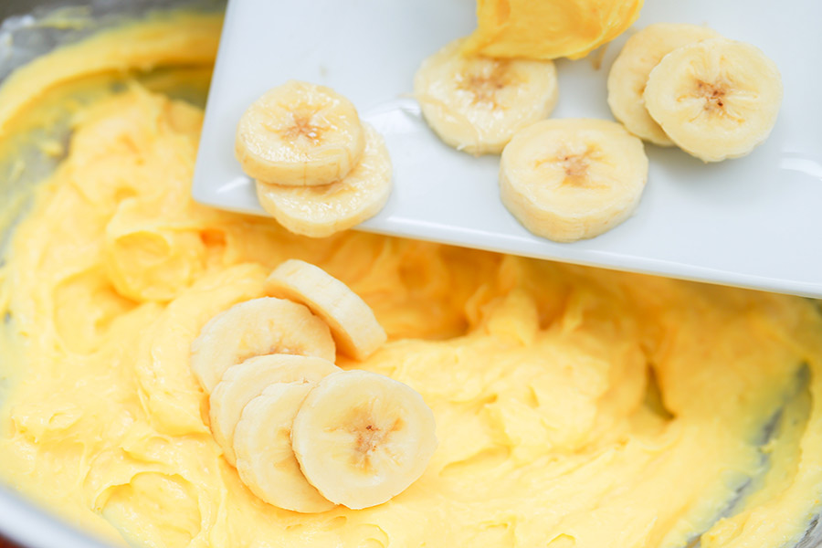 - Tiếp theo, cho chuối đã ngâm vào hỗn hợp rồi trộn đều thật nhẹ nhàng.