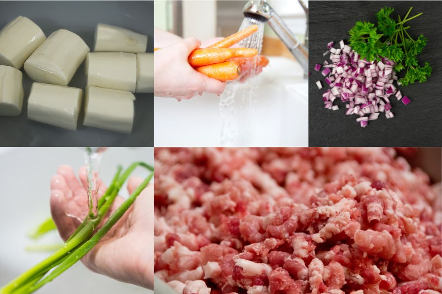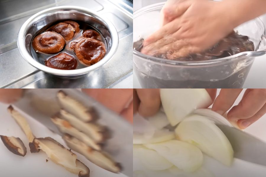 - Sau khi mua nấm hương khô về thì ngâm trong nước ấm khoảng 10 – 15 phút cho nở. Sử dụng dao để cắt phần chân nấm và băm nhuyễn.