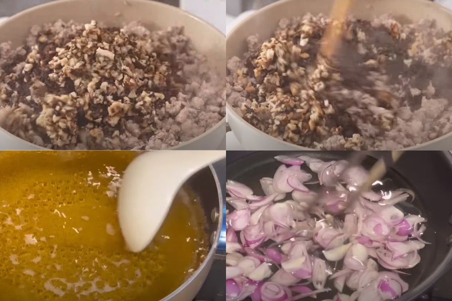 - Đặt một chảo dầu ăn lên bếp và để vừa lửa. Phi hành tím cho thơm, sau đó hòa trộn cả thịt xay và nấm để xào cho săn lại.