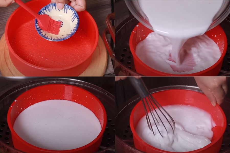 - Bắc nồi lên bếp khoảng 1 lít nước và cho khuôn bánh vào hấp cách thủy. Cứ mỗi 7 phút, bạn mở nắp nồi và đổ thêm 1/3 phần bột cho đến khi hết bột.