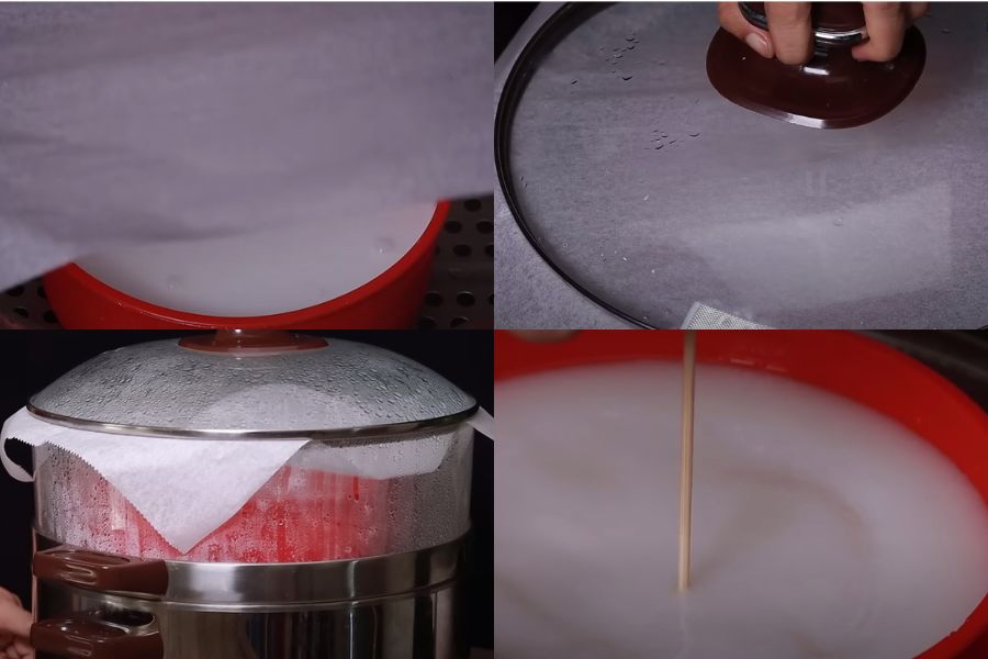 - Hấp bánh trong khoảng 15-20 phút, chọc tăm vào mà không dính nghĩa là bánh đã chín.