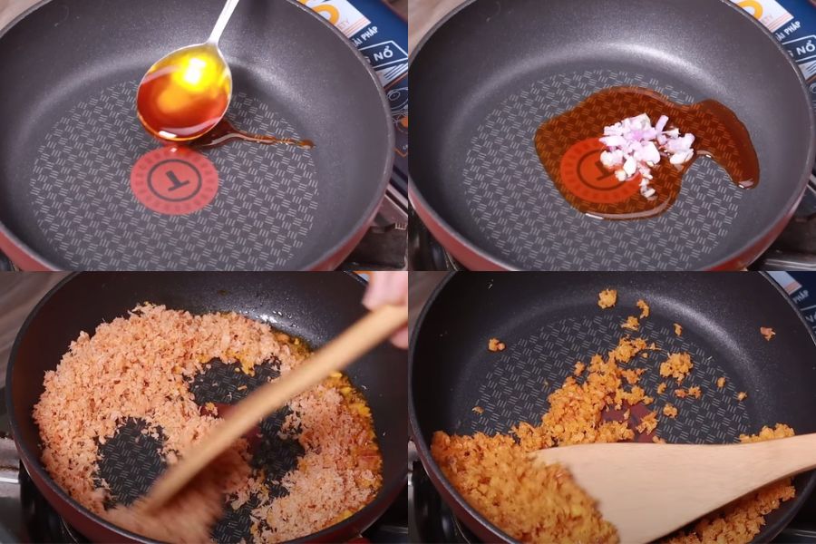 - Bắc chảo lên bếp cùng với 2 thìa dầu ăn. Đợi dầu nóng thì cho phần tỏi băm và hành tím vừa băm vào phi thơm, để lửa vừa.
