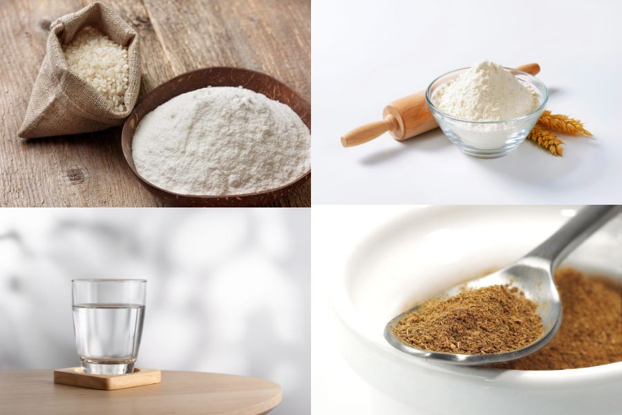 - Chuẩn bị một nồi lớn và trộn chung 150gr bột gạo tẻ, 150gr bột năng, 1/2 thìa cafe muối, và 700ml nước vào nồi.