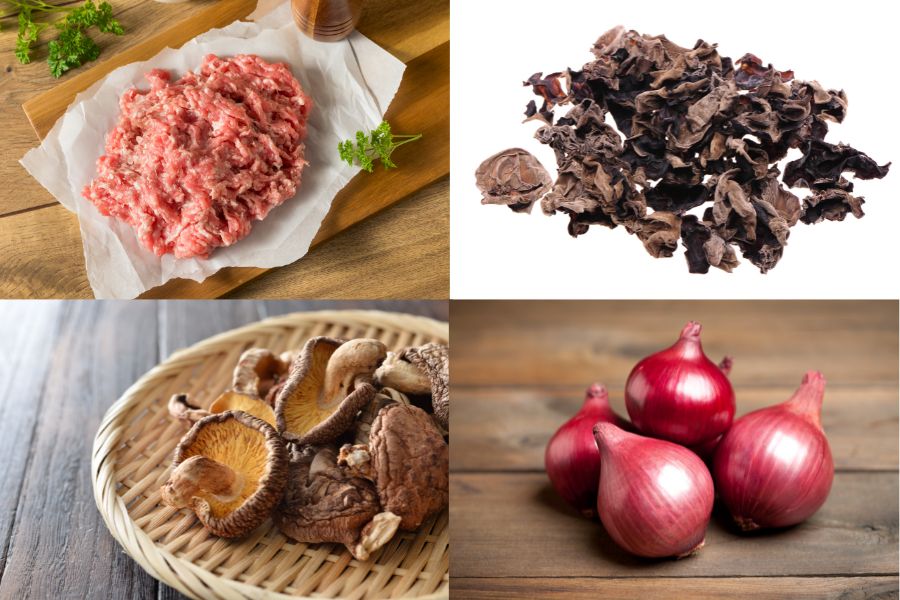 - Chuẩn bị một cái bát lớn rồi cho thịt xay, nấm hương và mộc nhĩ vào rồi trộn đều. Sau đó cho thêm ít muối hạt nêm và nước mắm rồi nếm sau cho vừa khẩu vị.