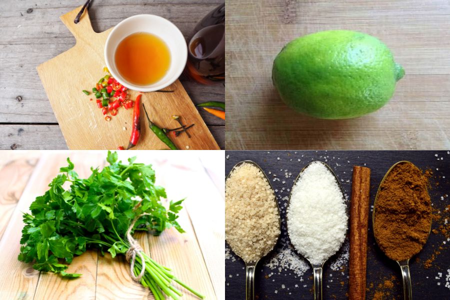 - Gia vị khác: đường, tiêu xay, dầu ăn, dầu mè