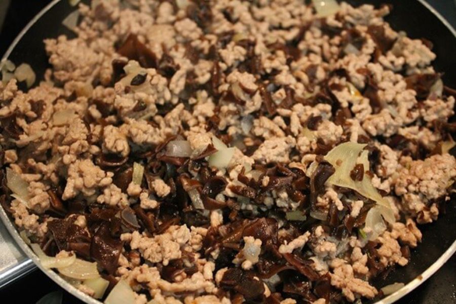 - Thịt gần chín thì bạn cho mộc nhĩ và nấm hương, tỏi, hành tây, hành tím băm.