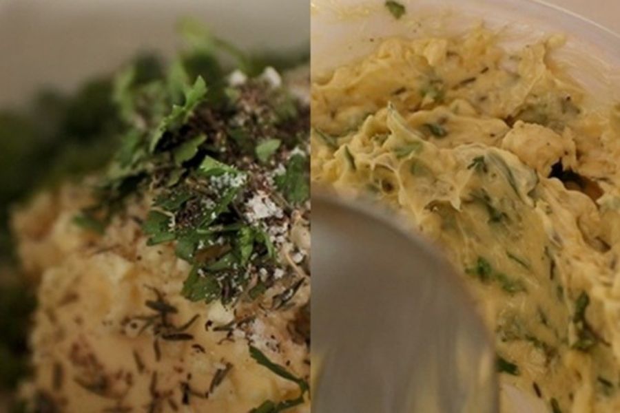 - Lấy bơ đã tan cho vào âu, thêm ngò rí, Thyme, muối, đường, 1 ít tiêu vào trộn đều.