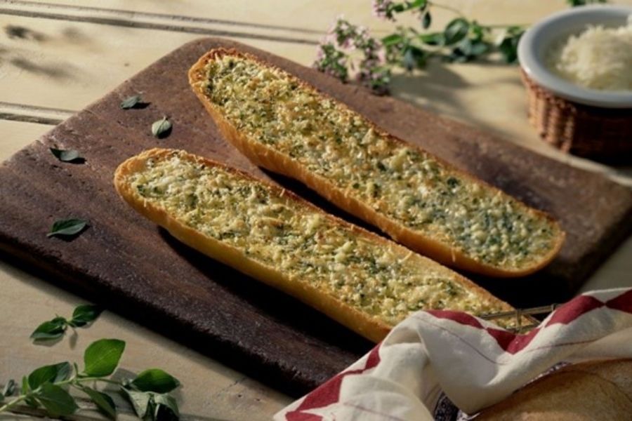 Cắt lát ra và thưởng thức bánh mì giòn tan thơm mùi của cỏ xạ hương và ngò rí, kết hợp với tỏi cùng vị béo ngậy của bơ và phô mai.