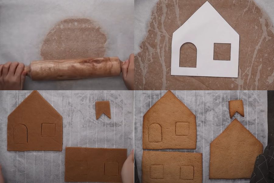 - Dùng khuôn để tách bột thành hình ngôi nhà.