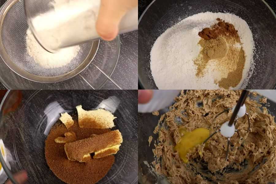 - Cho vào tô 420g bột mì đa dụng. Bỏ thêm 5g bột gừng, 3g bột quế, 3g muối, ⅛ thìa cafe baking soda rồi trộn đều các nguyên liệu.