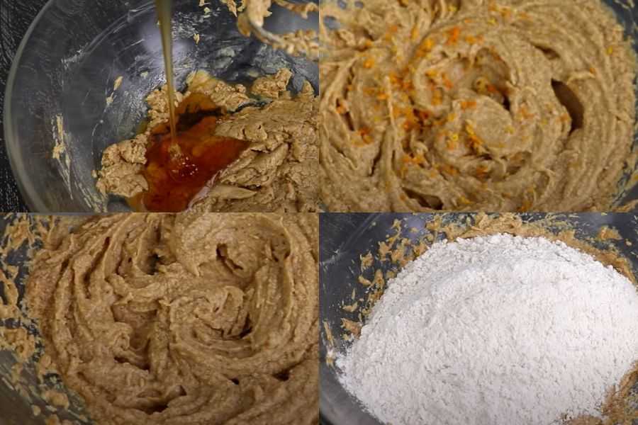 Bước 2: Cho vào tiếp 70g mật ong và bào vỏ của 1 nửa quả cam vào trộn chung với hỗn hợp. Cho toàn bộ phần bột mì vào và trộn đều.