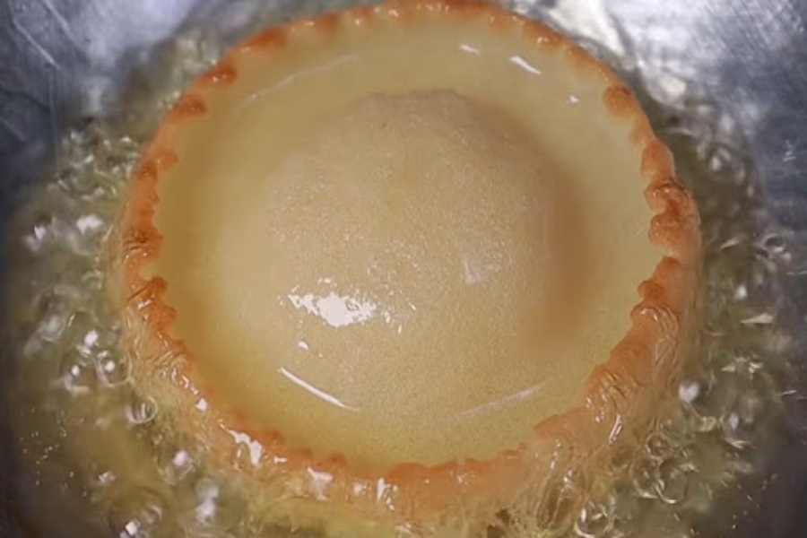 - Chiên đến khi chín vàng đều, phần giữa phồng lên còn rìa bánh cong nhẹ.