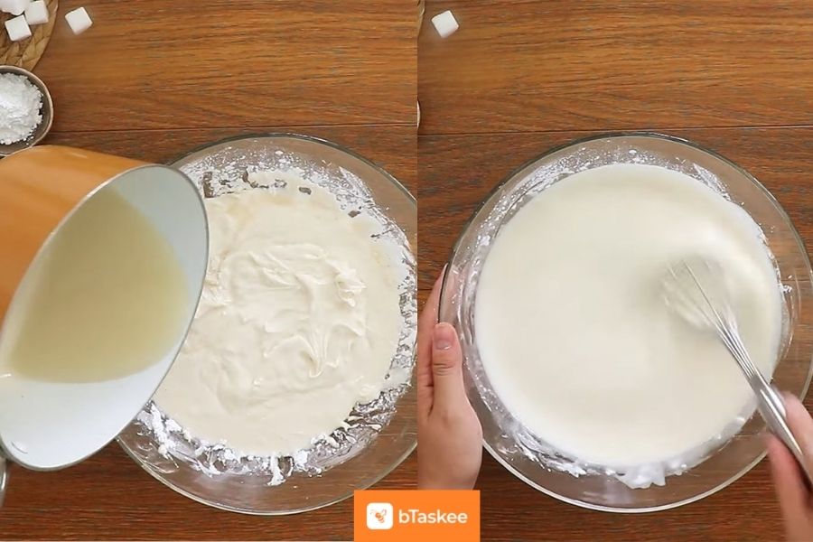 - Cho từ từ phần nước cốt dừa vào hỗn hợp bột bánh.