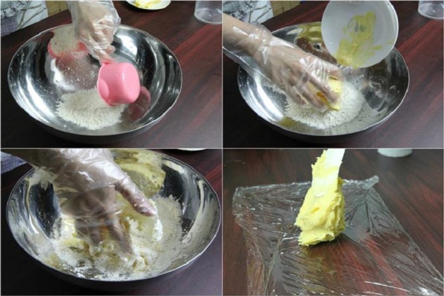- Cho 100gr bột mì, 200gr bơ vào âu rồi nhào mịn.