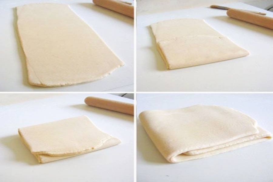 - Lấy bột ra và tiếp tục cán mỏng rồi gấp làm 3.