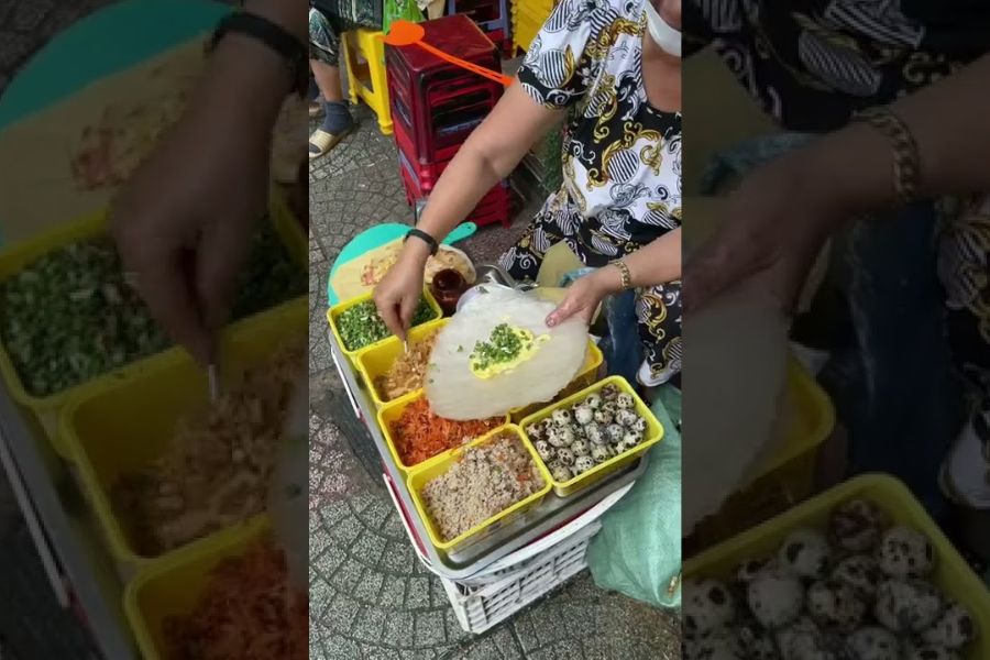 Bánh tráng tại đây có đa dạng nhiều topping như mắm ruốc, tóp mỡ, trứng cút, mỡ hành, nem chua, bơ,… Hương thơm ngào ngạt hấp dẫn của món bánh tráng Phan Thiết thu hút mỗi một vị khách khi ngang qua.