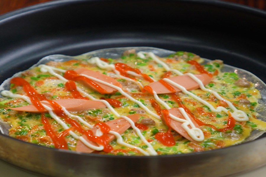 - Thêm 1 số lượng xúc xích tuỳ ý lên bề mặt bánh tráng. Nếu thích bạn có thể cho thêm phô mai, khô bò và ớt sa tế.