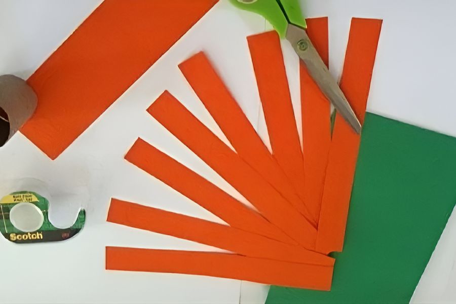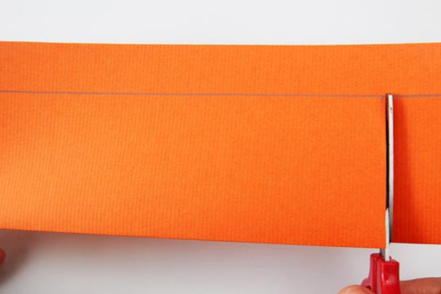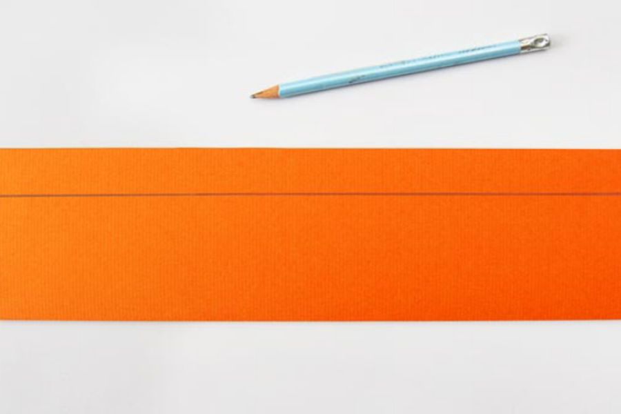 - Bước 1: Đầu tiên, bạn cắt tờ A4 màu cam thành các sợi nan có độ rộng khoảng 2 cm, chiều dài thì để theo chiều dài của tờ bìa nhé. Bạn cũng cần dán một ít keo 2 mặt vào các đầu nan giấy để dễ dàng thực hiện bước sau đó.