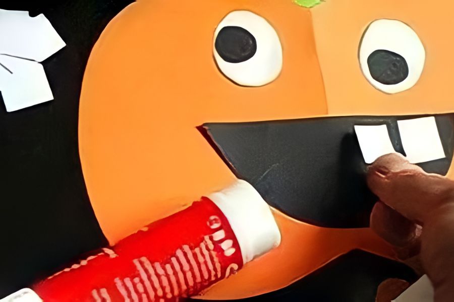 - Bước 6: Sử dụng bìa A4 màu đen để cắt mắt, mũi, miệng cho quả bí. Cuối cùng thì bạn dán cắc chi tiết vừa cắt lên quả bí là chúng ta đã có một quả bí vô cùng xinh xắn rồi.