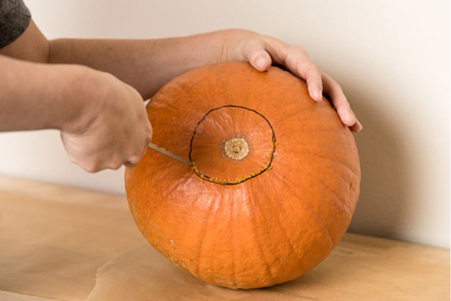 Bước 2: Bạn dùng dao để cắt theo đường tròn đã vẽ trước đó và lấy phần đã cắt ra khỏi quả bí. Bạn đừng vứt phần đã lấy ra mà hãy giữ lại để dùng làm nắp để đậy thành phẩm lại nhé!