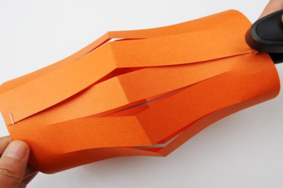 - Bước 4: Dùng kéo cắt các tờ giấy theo chiều ngang của mặt gấp. Các vết cắt cách nhau 2 cm và có chiều dài từ nếp gấp đến đường kẻ trước đó.
