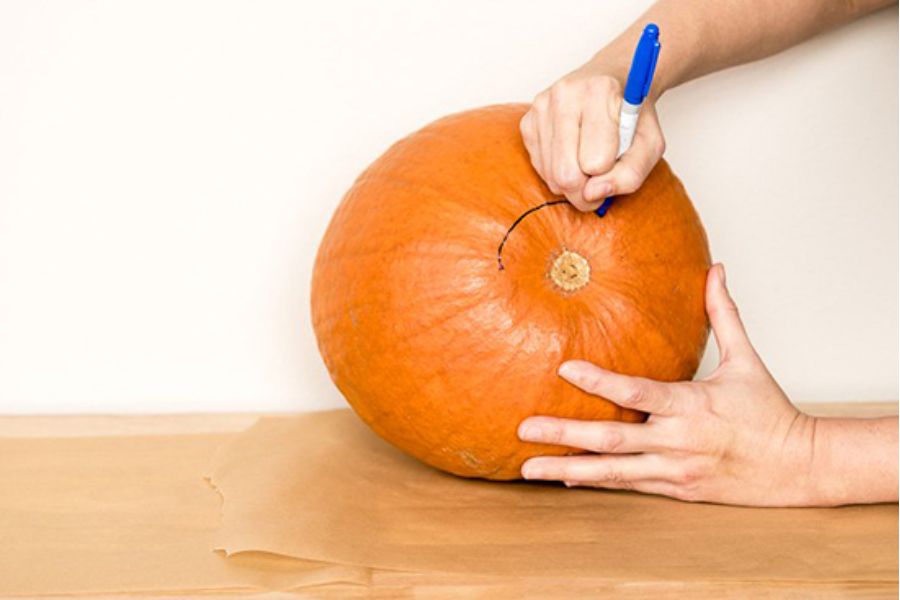 Bước 1: Ở bước đầu tiên, bạn cần sơ chế quả bí bằng cách rửa sạch, dùng bàn chải để loại bỏ các vết nhám thiếu thẩm mỹ rỗi để ráo nước. Dùng bút lông vẽ một đường tròn ở đầu đầu quả bí sao cho vừa đủ để có thể nạo được ruột.