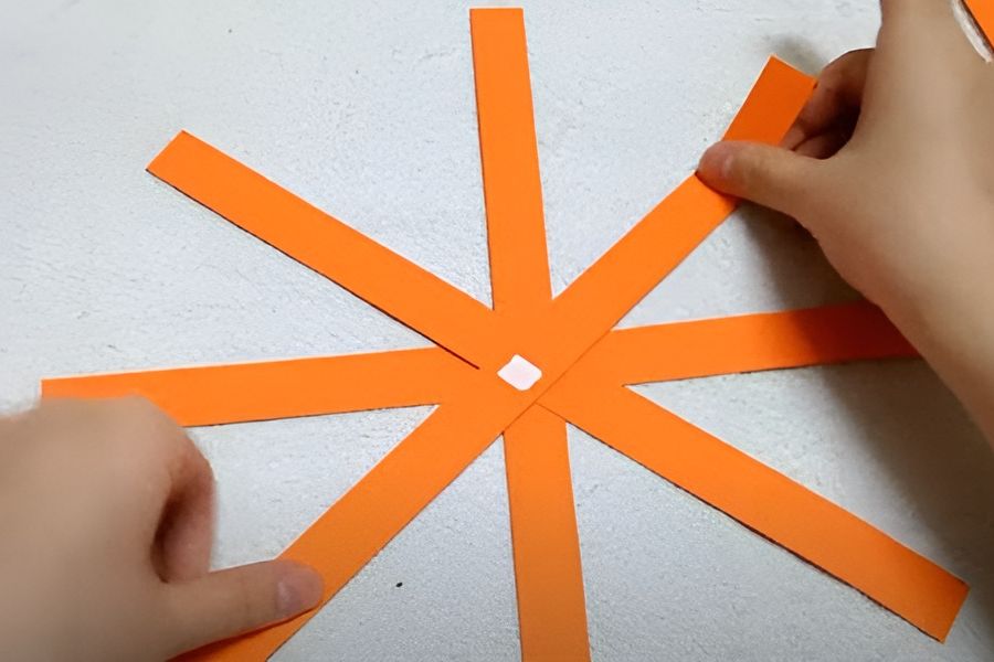 - Bước 2: Bạn hãy xác định điểm giữa của mỗi sợi, lấy đó làm tâm điểm và xếp chồng các sợi nan lên nhau giống hình nhé. Bạn đừng quên dùng keo 2 mặt để giúp các sợi nan được cố định với nhau.