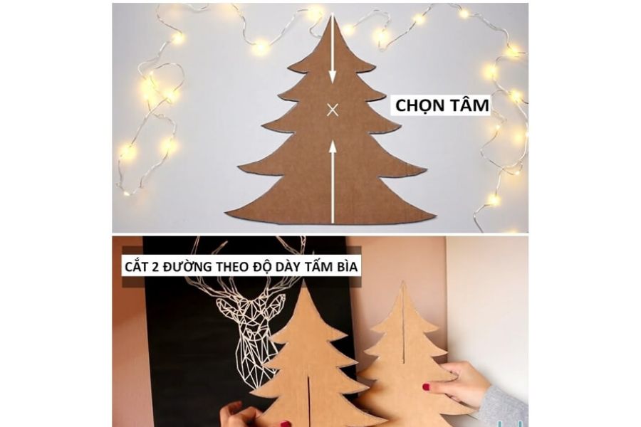 Bước 3: Xác định tâm điểm trên cả 2 cây thông sau khi cắt. Cây thứ 1 bạn cắt một đường ở giữa từ dưới lên đến điểm trung tâm thì dừng lại. Cây thứ 2 bạn cắt theo chiều ngược lại cũng dừng tại tâm đã xác định trước đó.