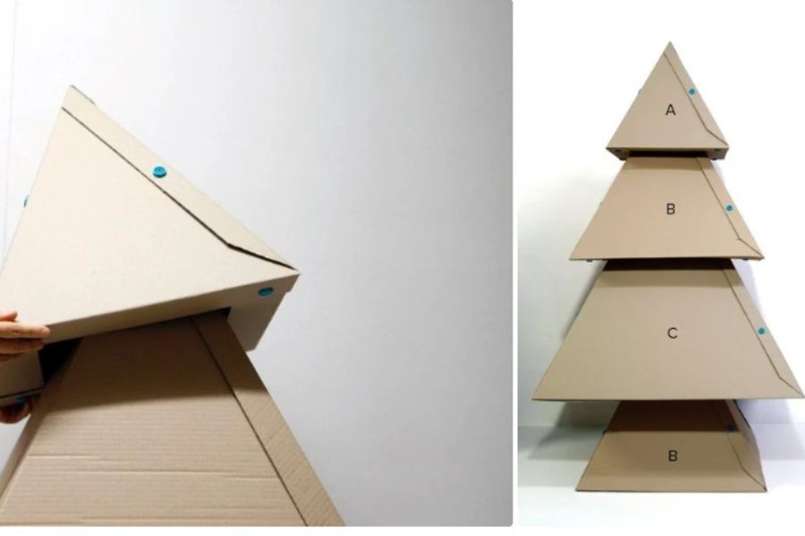Bước 4: Chồng 4 hộp lên nhau theo thứ tự từ lớn nhất đến nhỏ nhất là bạn đã tạo hình được một cây thông.