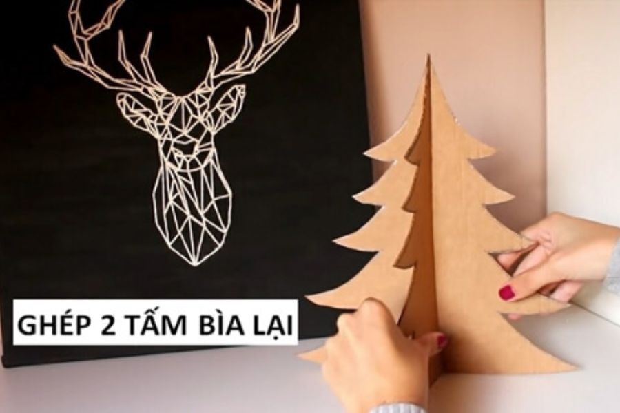 Bước 4: Bạn ghép 2 cây thông lại với nhau theo đường đã cắt. Lưu ý không để bìa carton bị cong sẽ làm cây thông không được đẹp nữa. Bạn có thể thêm một chút keo để cây thông được chắc chắn hơn.