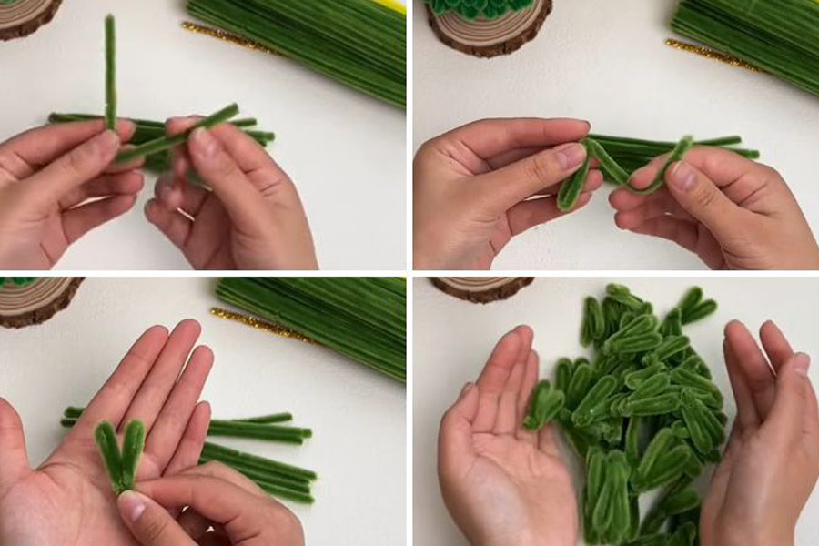 Bước 2: Gấp đôi những cọng kẽm nhung này lại, rồi gấp 2 đầu vào chính giữa. Xoay nhẹ tại điểm chính giữa để cố định nếp gấp.